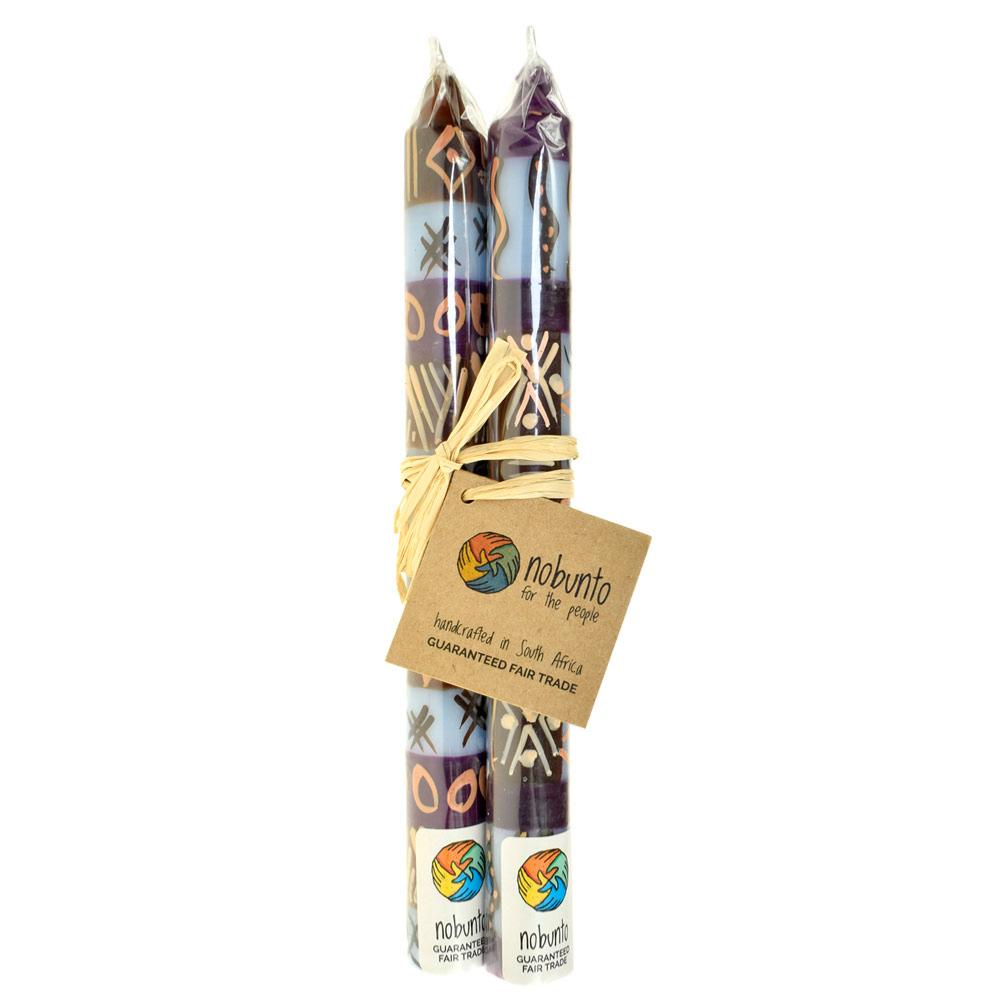 2 long hand painted dinner candles tied together with an attractive raffia bow