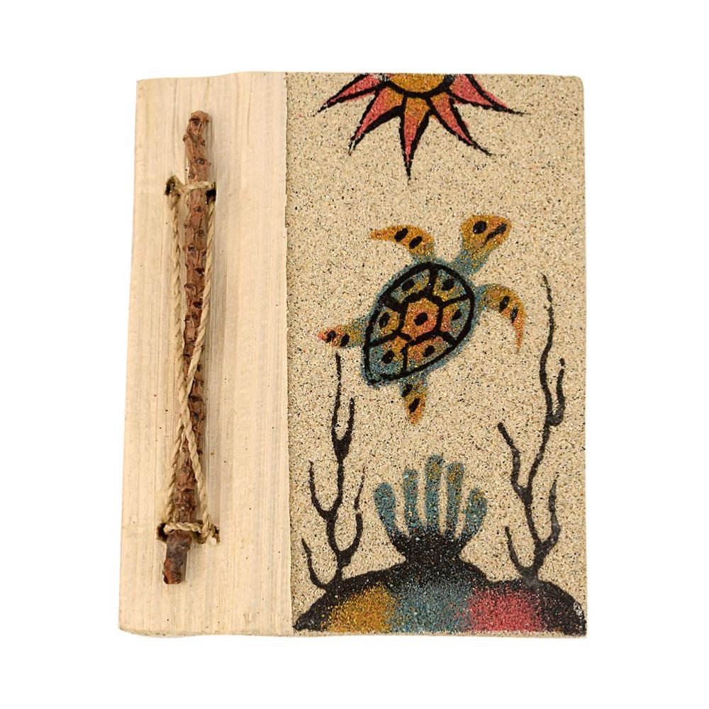 A beautiful handmade notebook made from various grasses and leaves with sand painted decorative cover
