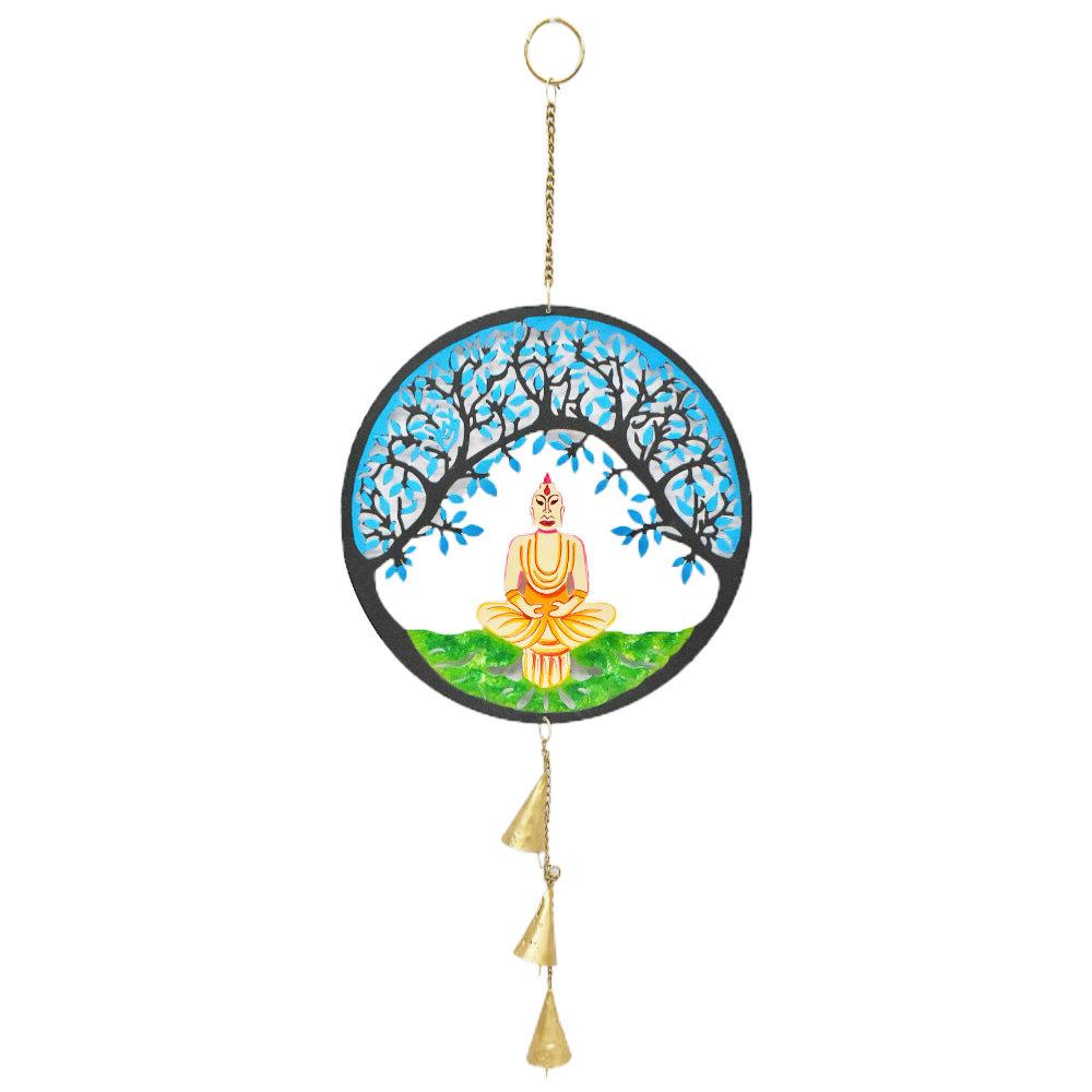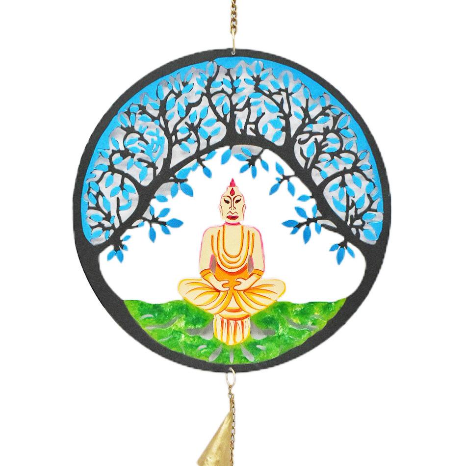 Hanging Windchime Metal Buddha under Tree Blue 20cm diameter
