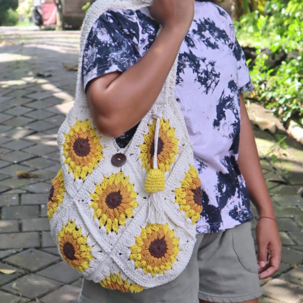 Shoulder / Tote Bag Crochet Yellow Brown Flowers 34 x 60cm